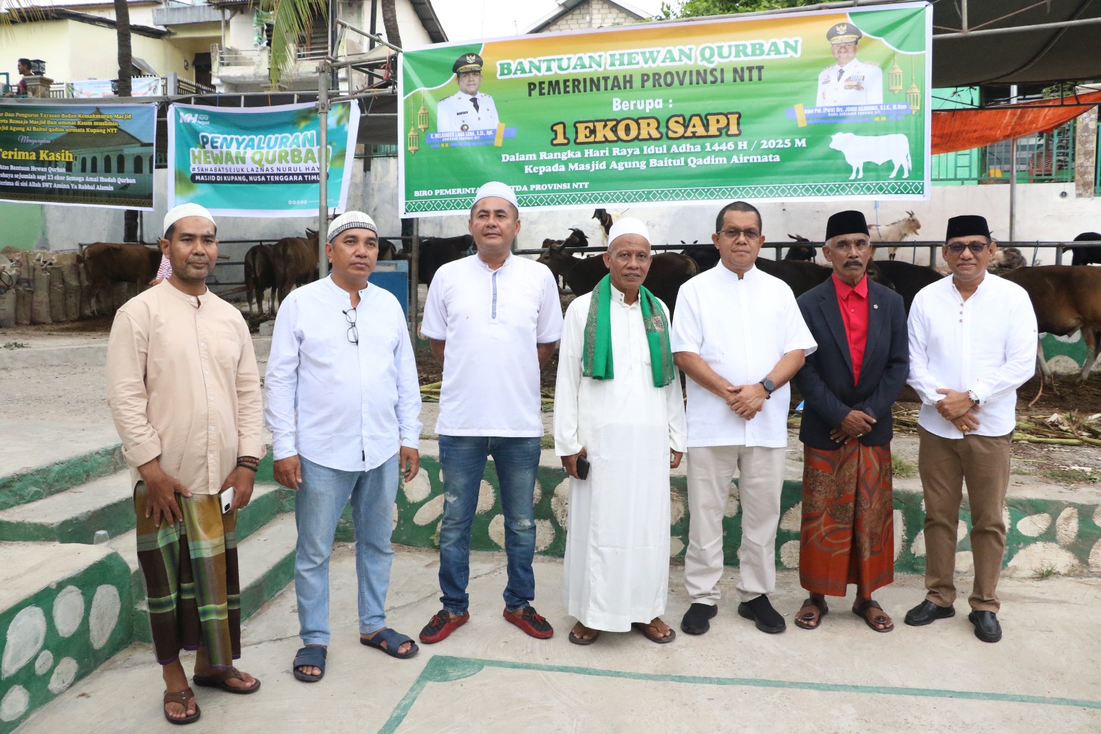 Suarantt.id, Kupang-Dalam suasana penuh kekeluargaan dan kebersamaan umat, Gubernur Nusa Tenggara Timur (NTT), Emanuel Melkiades Laka Lena, menyerahkan secara simbolis bantuan kemasyarakatan dari Presiden Republik Indonesia berupa hewan kurban kepada umat Muslim di Masjid Baiturrahman Bakunase, Kota Kupang, pada Jumat (6/6/2025). Penyerahan ini dilanjutkan dengan peninjauan proses penyembelihan hewan kurban bantuan Pemerintah Provinsi NTT di Masjid Agung Al-Baitul Qadim.