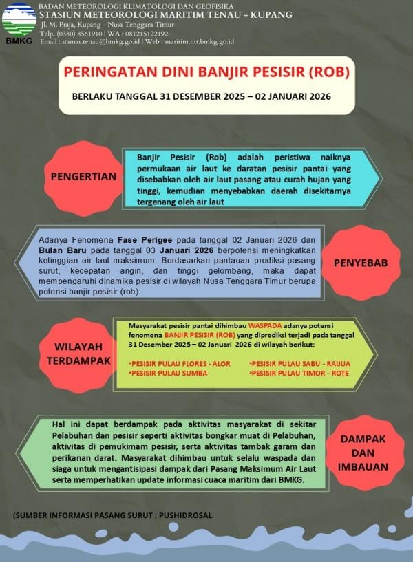 Suarantt.id, Kupang-Badan Meteorologi, Klimatologi, dan Geofisika (BMKG) mengeluarkan peringatan dini potensi banjir pesisir (rob) yang diperkirakan melanda sejumlah wilayah pesisir di Provinsi Nusa Tenggara Timur (NTT). Ancaman banjir rob ini diprediksi terjadi mulai 30 Desember 2025 hingga 10 Januari 2026 dan berpotensi berdampak signifikan terhadap aktivitas masyarakat pesisir.