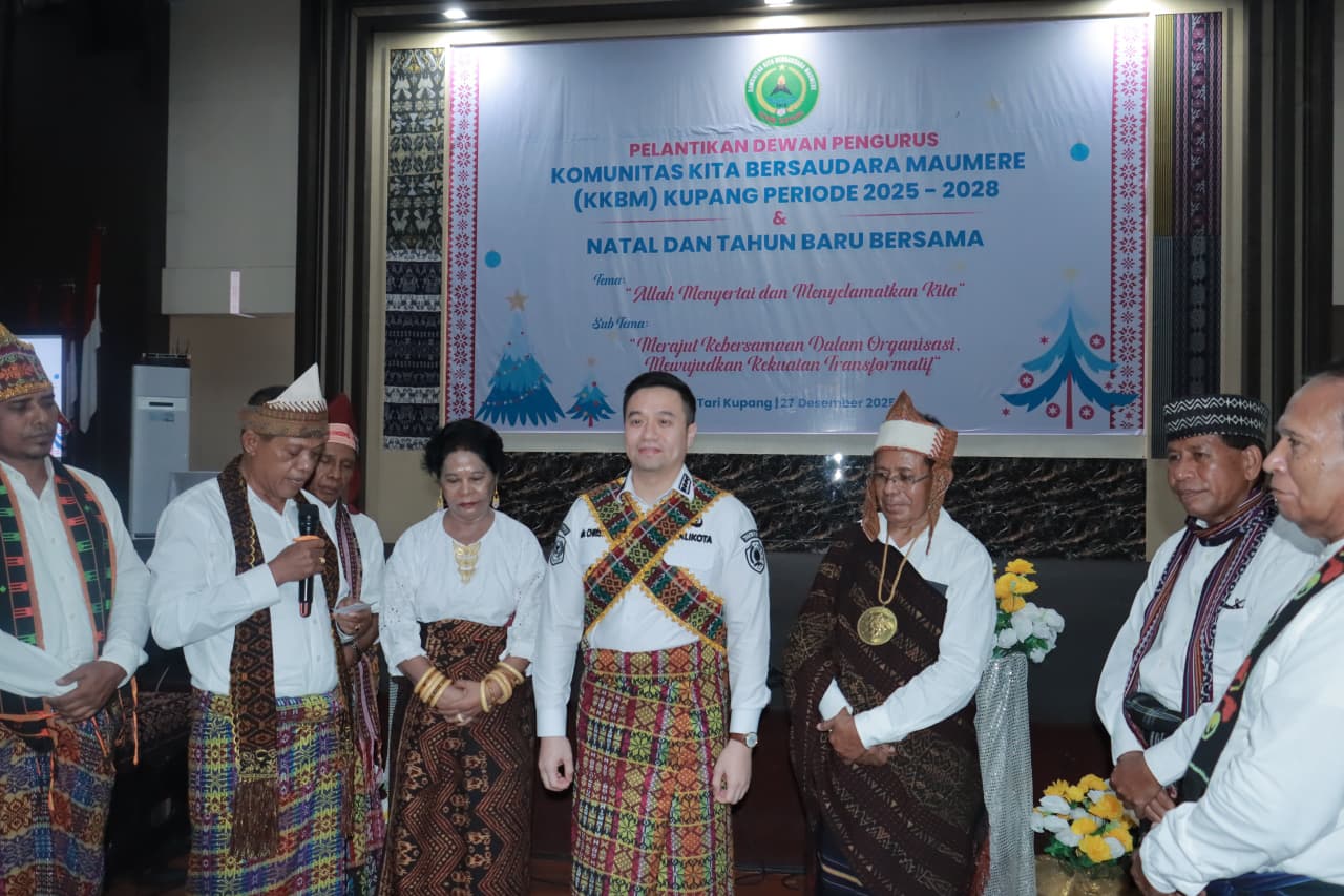 Suarantt.id, Kupang-Wali Kota Kupang, dr. Christian Widodo, secara resmi mengukuhkan Badan Pengurus Komunitas Kita Bersaudara Maumere (KKBM) Kupang periode 2025-2028 dalam sebuah seremoni yang berlangsung khidmat di Aula El Tari Kupang pada Sabtu (27/12/25). Pengukuhan ditandai dengan pengambilan sumpah dan janji jabatan serta penyerahan pataka kepada Ketua Umum KKBM Kupang, Agustinus Bajo.