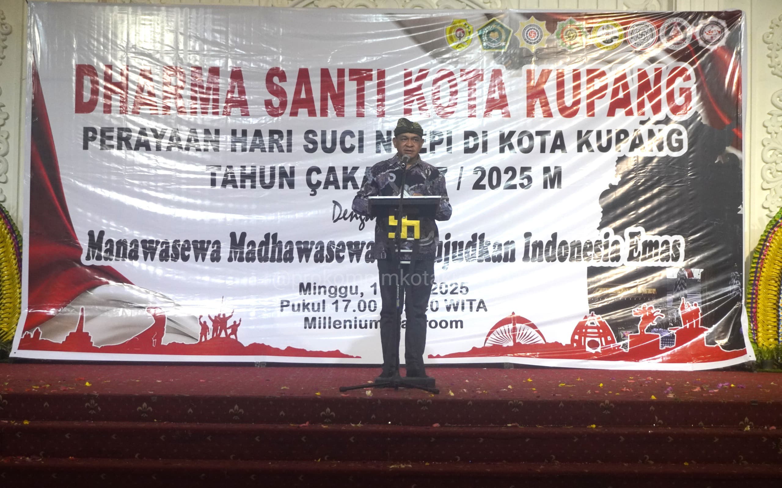 Membacakan sambutan Wali Kota Kupang, Pj. Sekda Ignasius R. Lega menyampaikan apresiasi kepada Parisadha Hindu Dharma Indonesia (PHDI) Kota Kupang dan umat Hindu atas pelaksanaan perayaan yang berlangsung tertib, khidmat, dan sarat nilai spiritual.