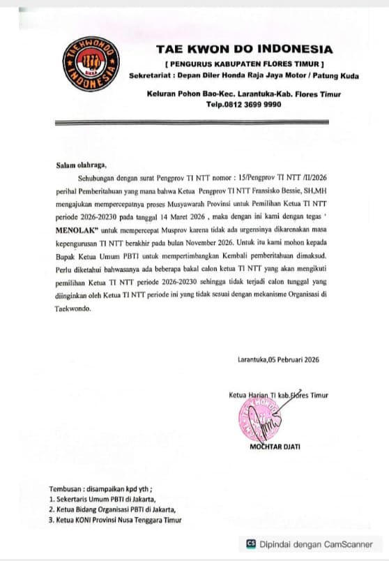 Penolakan tersebut disampaikan melalui surat resmi yang ditujukan kepada Pengurus Besar Taekwondo Indonesia (PBTI) di Jakarta. Surat itu merupakan respons atas pemberitahuan dari Pengurus Provinsi Taekwondo Indonesia NTT (Pengprov TI NTT) dengan Nomor: 15/Pengprov TI NTT/II/2026 tentang percepatan pelaksanaan Musprov untuk pemilihan Ketua TI NTT periode 2026-2030.