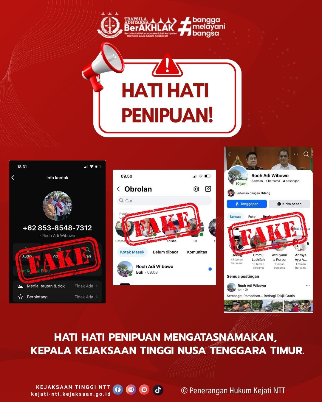 Dalam beberapa waktu terakhir, beredar akun palsu di media sosial Facebook serta nomor WhatsApp yang mengaku sebagai Kajati NTT untuk melakukan penipuan.